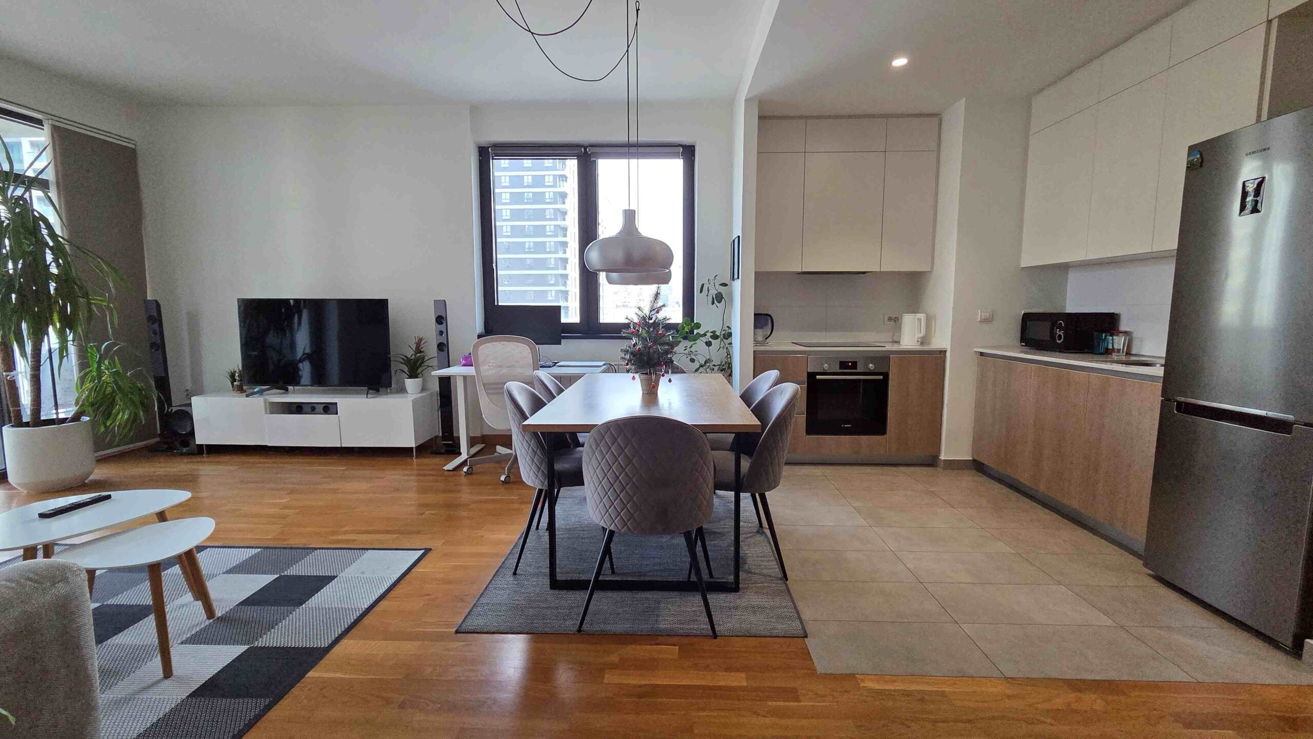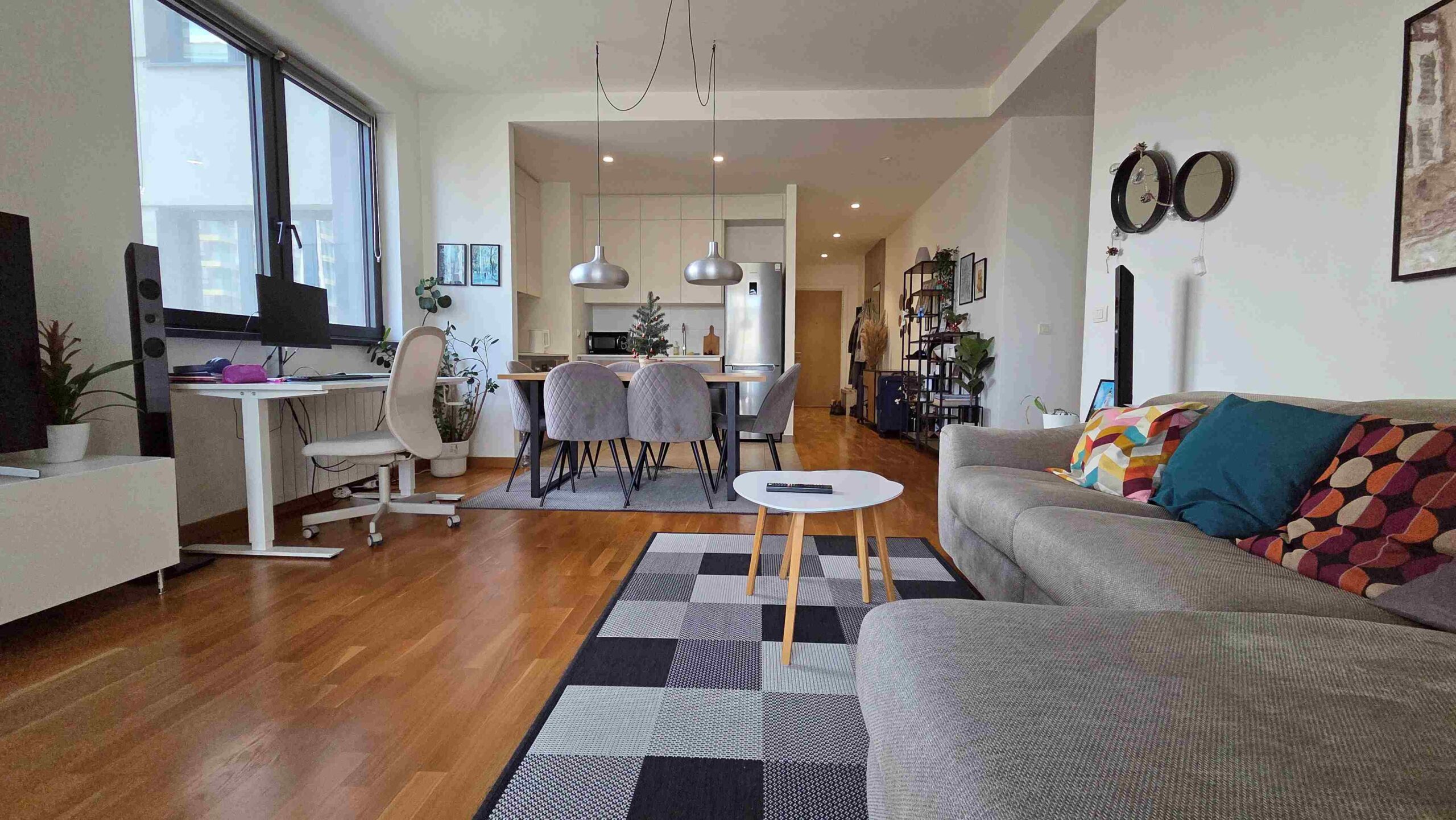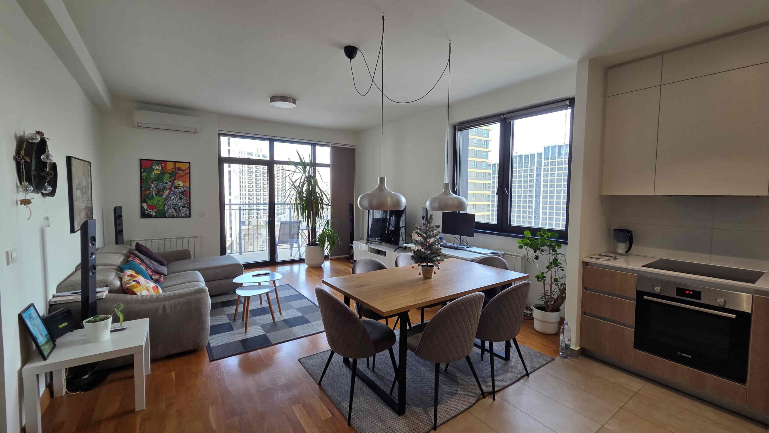 Komforan, moderan i svetao dvosoban stan, dvostrano orijentisan, otvorenog pogleda. Veliki dnevni boravak sa kuhinjom, trepzarijom i izlazom na terasu. Veliko kupatilo i spavaća soba. Zasebno vešernica u ulaznom hodniku. Prodaje se namešten (nije uslov). Visina plafona 2.80m. Pripadajuća podrumska ostava. Garažno mesto 12m2 po ceni od 25.000 eur. Idealan za život i kao investicija. Trenutno pod zakupom. Vredi pogledati.