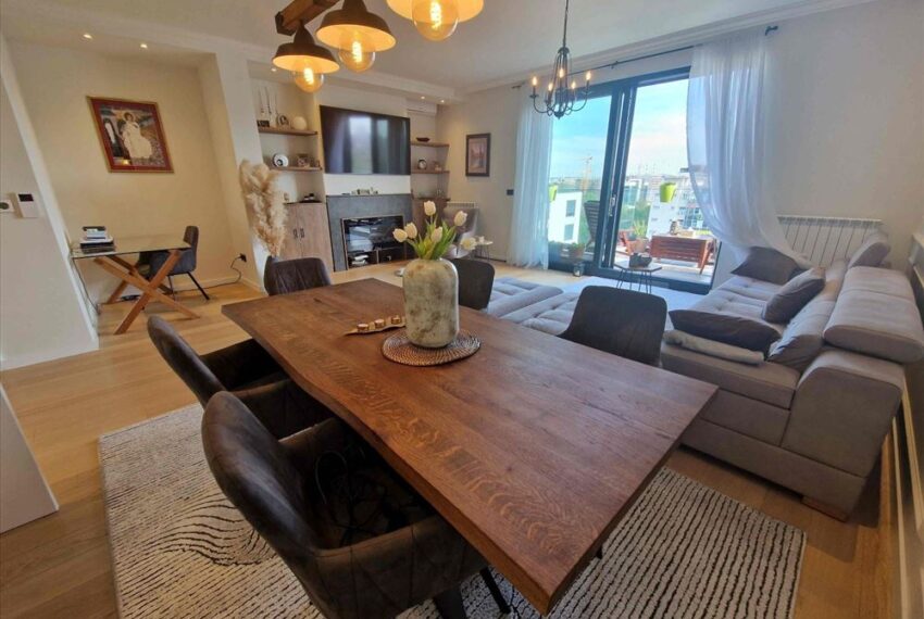 Izuzetan porodični stan, funkcionalnog rasporeda. Dnevni boravak sa kuhinjom površine 52 m2, južne orijentacije sa lepom terasom, visina plafona 3.85 m, svetao i dvostrano orijentisan. Odvojen spavaći blok koji gleda ka zelenilu sa 3 spavaće sobe, jedna master bedroom sa kupatilom i garderoberom, u hodniku spavaćeg dela drugo kupatilo, zasebna prostorija za vešeraj i zasebna ostava + gostinski toalet u ulaznom delu u stan. Centralno grejanje na kalorimetre, po potrošnji.