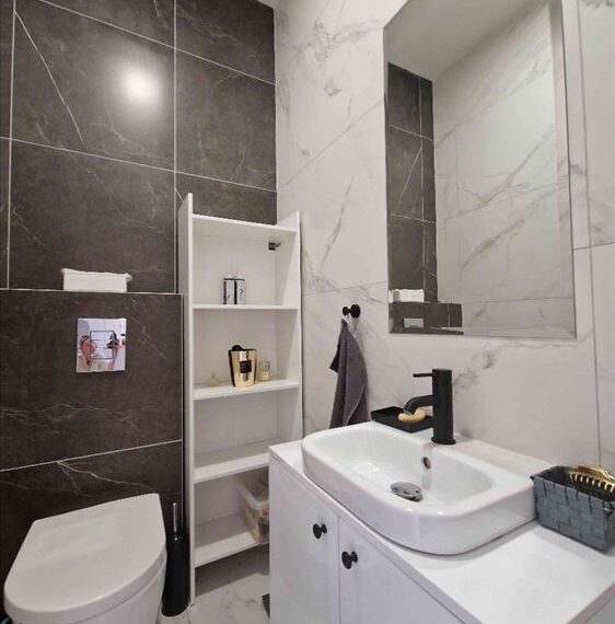 An exceptional family apartment with a functional layout. Living room with kitchen, surface area 52 m2, south orientation with a nice terrace, ceiling height 3.85 m, bright and oriented on both sides. A separate sleeping block overlooking the greenery with 3 bedrooms, one master bedroom with a bathroom and wardrobe, another bathroom in the hallway of the bedroom, a separate laundry room and a separate storage room + guest toilet in the entrance area of the apartment. Central heating on calorimeters, according to consumption. It is sold fully furnished (not a condition) + garage space 14 m2, right next to the elevator for 25.000 euros. Worth a look!